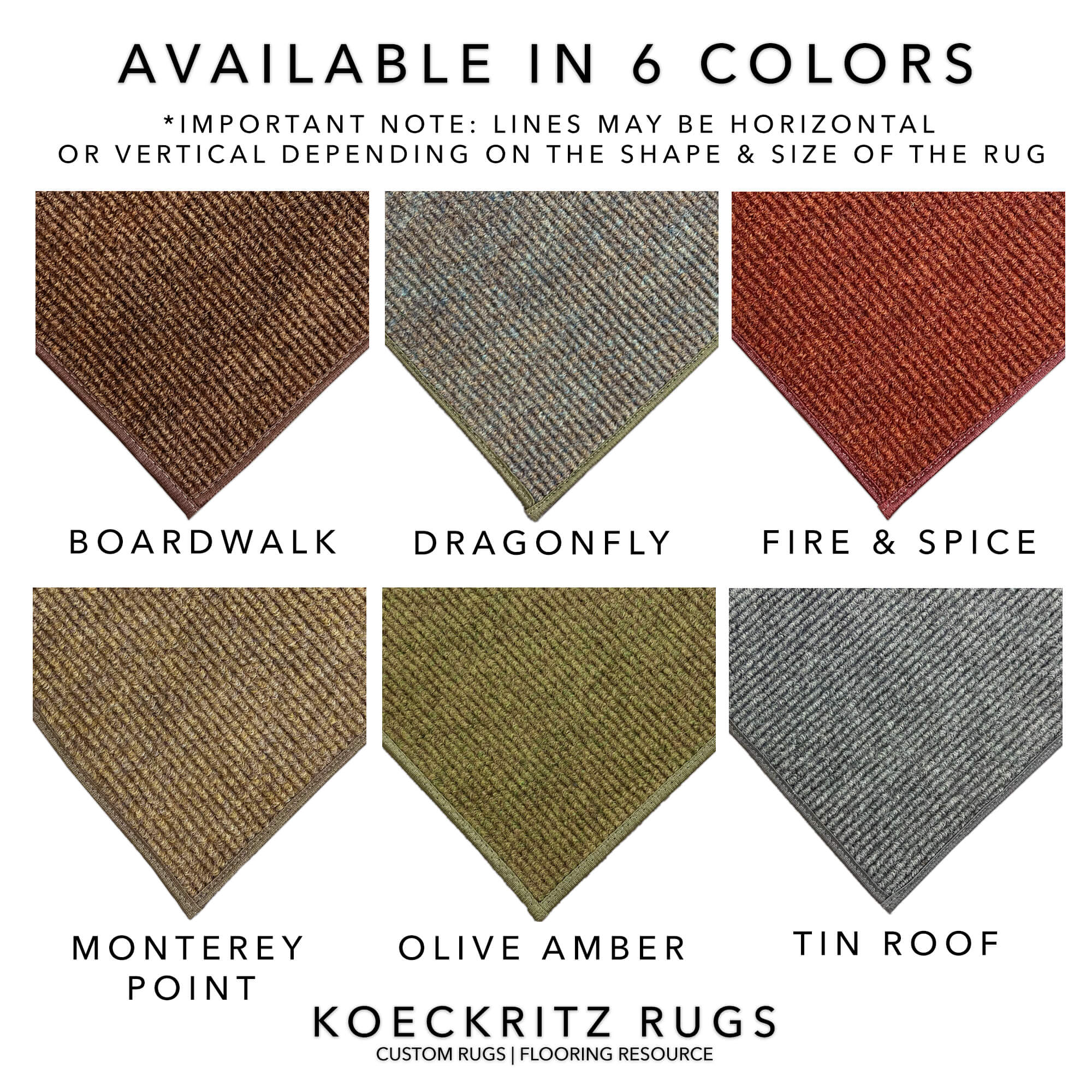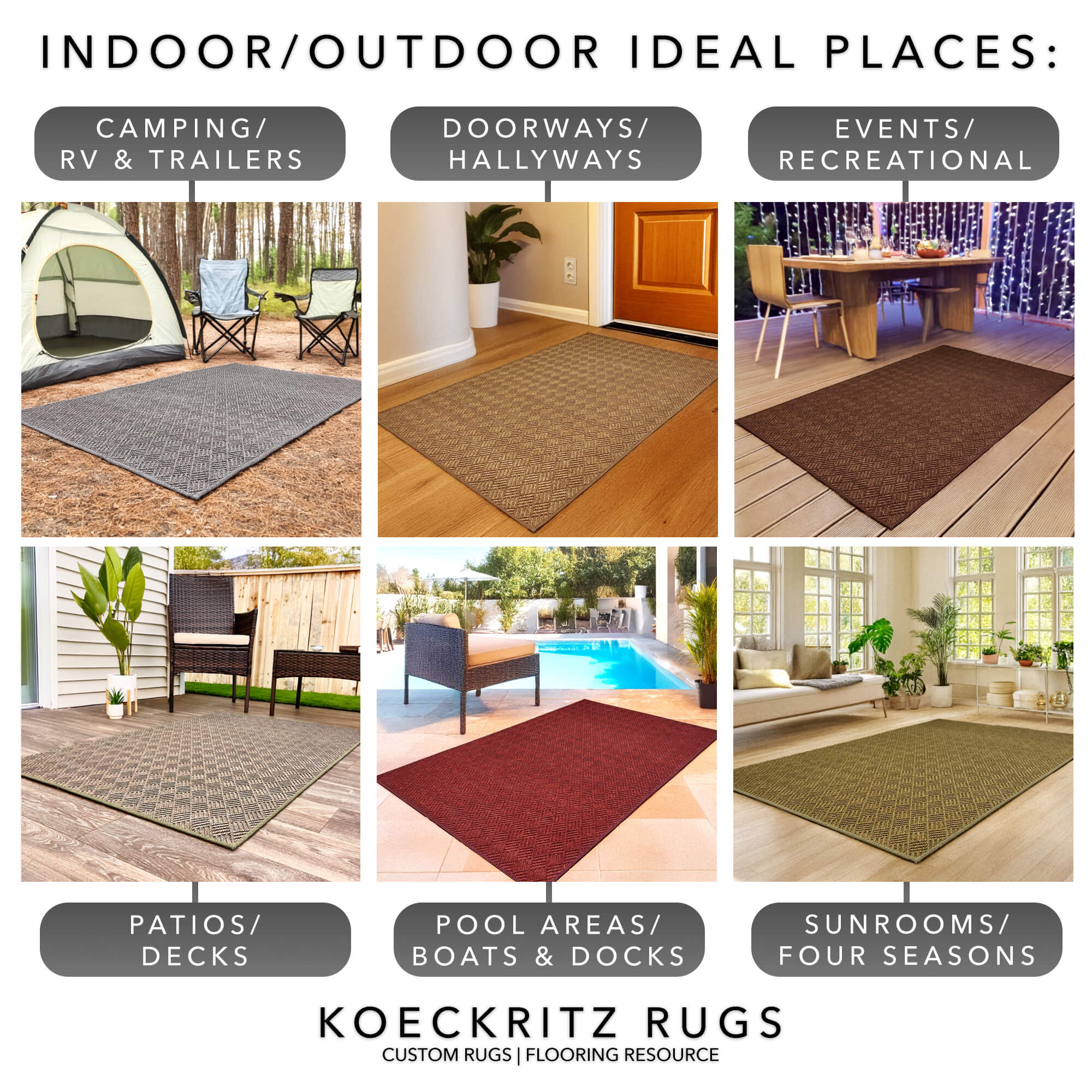 Our products are durable and versatile, and our huge selection of colors and styles ensures that you can find the perfect rug for any space. Shop our outstanding collection of mildew-resistant outdoor carpets at Koeckritz Rugs to instantly upgrade your front porch, back patio, entryway, or commercial space.