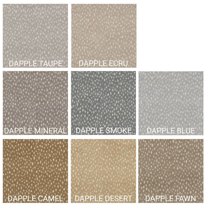 Milliken Dapple Exotic Escape Indoor Area Rug Collection | 3/8″ Thick 40 oz Cut Pile Indoor Area Rug is made with 100% Stainmaster Nylon. Dapple Exotic Escape Area Rug Collection is made with Lotus FX Fiber Shield stain protection. Therefore, it is Easy to Clean!!! This collection is a 3/8” thick 40 oz. face weight carpet. The dense pile is sure to hold up in active households, soiling, pet urine stains and static shock. Finally, rug pad prolongs the life of your carpets and rugs. Therefore, we recommend rug pad for all area rugs and carpet. Custom cut on site. Made in the U.S.A. Custom production time 2-3 weeks. Available in stair treads. Dapple can also be installed as wall-to-wall carpeting. Contact us for more details.