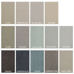 | Color | Angora, Blue Pearl, Buttercream, Cornerstone, Dried Herb, Faded Blush, Flax, Harbor Blue, Lagoon, Pewter, Raven, Seaglass, Sesame, Silver Mist |
