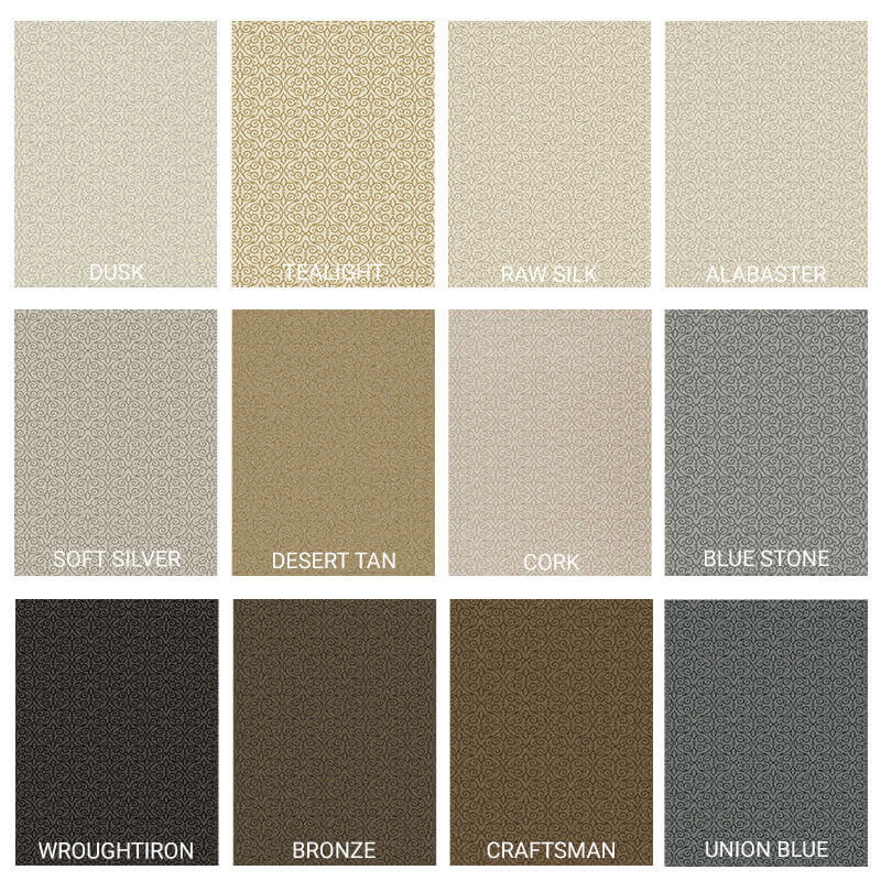 | Color | Alabaster, Bluestone, Bronze, Cork, Craftsman, Desert Tan, Dusk, Soft Silver, Raw Silk, Tea light, Union Blue, Wrought Iron |